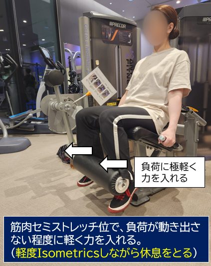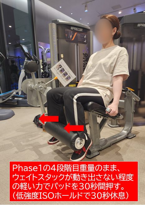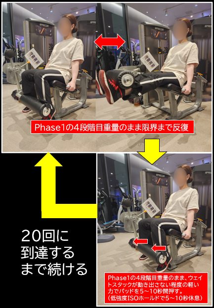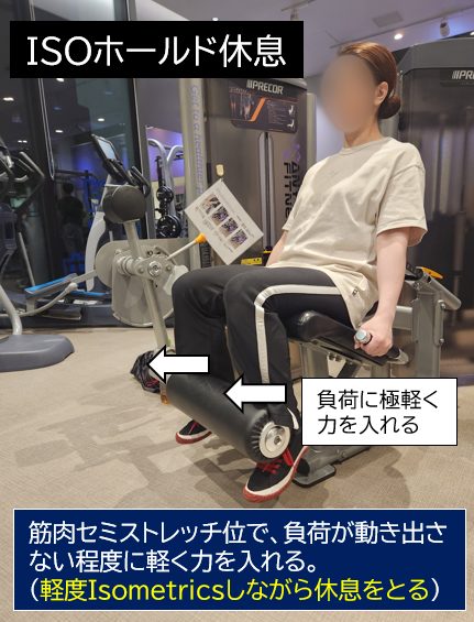 ISOホールド休息とは、極軽いアイソメトリック筋収縮をしながら休息をとることです。私の場合、筋肉がセミストレッチした状態でこれを行ないます。対象筋がジンジンしてキツく感じますが、これでもPhase3をこなすための休息になります。