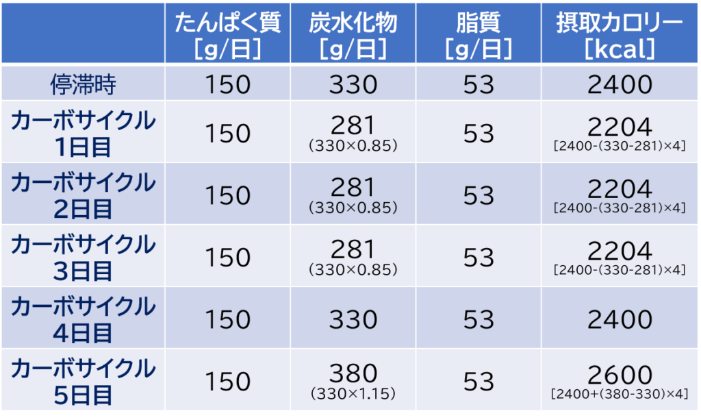 減量の停滞と判断した際の摂取カロリーが2400kcal、たんぱく質摂取量が150g/日、脂質摂取量が53g/日、炭水化物摂取量が330g/日でした。停滞打破のため上項に従い、以下のようにカーボサイクルを組んで数週間繰り返しました。