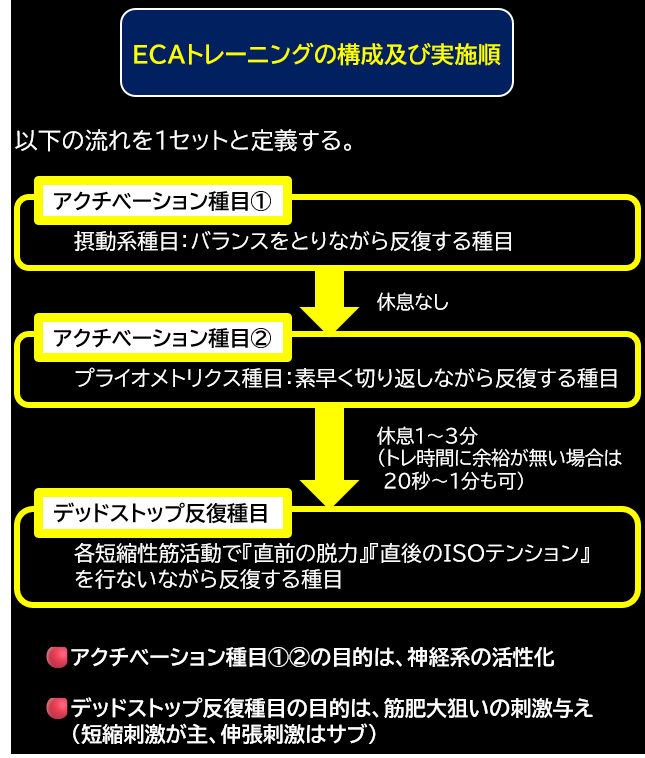 本日は、別パターンである『ECAトレーニング法』を紹介します。神経系活性化のアクチベーション種目と、反射ではなく随意的に挙上時の筋繊維動員を高めようとするデッドストップ反復種目で構成しています。