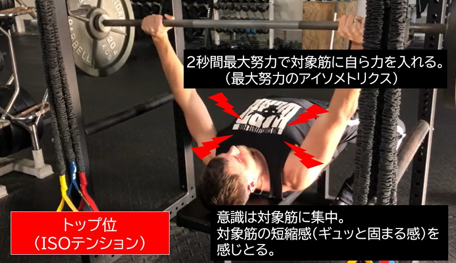 一般的なデッドストップ反復法は、ボトム位で一旦脱力して、静止した負荷を力強く瞬発的に挙上するものです。これにトップ位でのISOテンションを追加して、ECAトレーニングのデッドストップ反復法として採用しています。