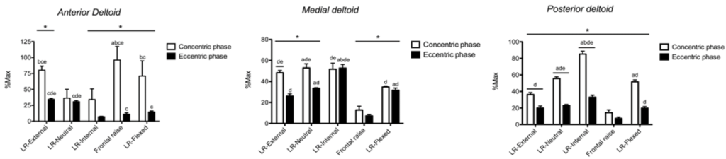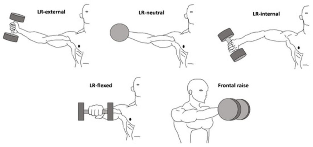 また、腕の向きによって三角筋の活性部位が異なることも筋電図で確認されています(Coratella氏他4名の研究)。