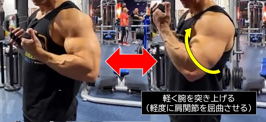 突き上げ具合が大きいと上腕二頭筋の収縮が抜けてしまいます(二関節筋の制約作用や肘回りの負荷トルクの減少)。最適な突き上げ具合の場合、上腕二頭筋上部の強い収縮感が得られますので、これを頼りに自分にあった突き上げ具合を把握します。