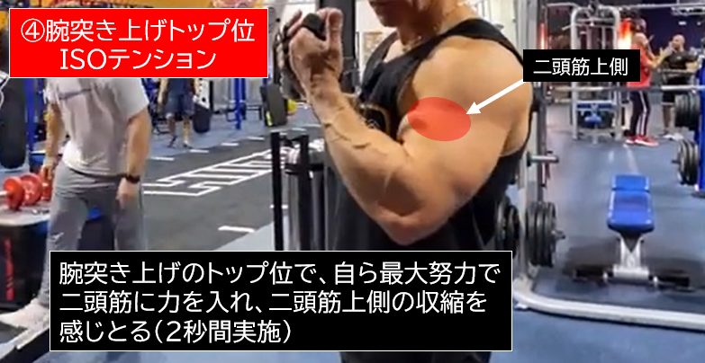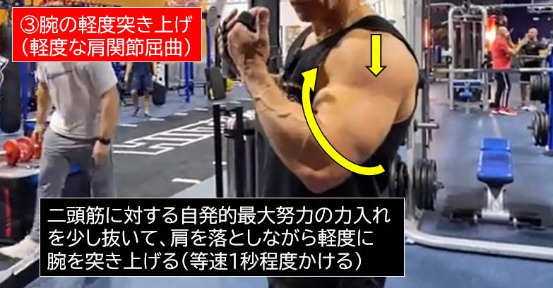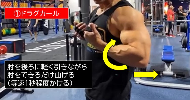 これは、上腕二頭筋下側(遠位部)に特化した『ドラグカール』と、上腕二頭筋上部(近位部)に特化した『軽度な腕の突き上げ(肩関節の軽度な屈曲動作)』で構成しているからです。