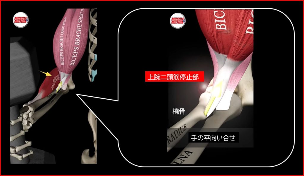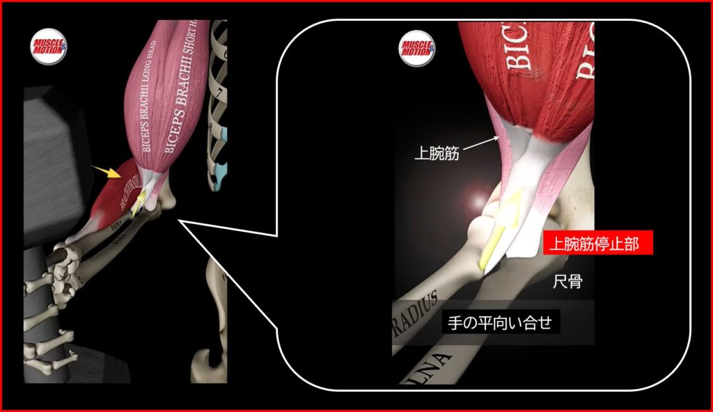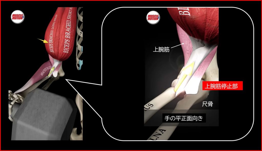上腕筋の停止部は尺骨にあるので、グリップの向きによってその活動が低下することはありません(グリップが変わっても尺骨は回転しない)。