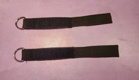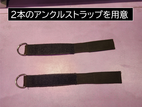 ケトルベルにFATGRIPZを取り付けるために、ジム備品のアンクルストラップ2本を使用します。できるだけシンプルなものが良いです。