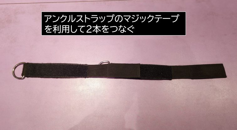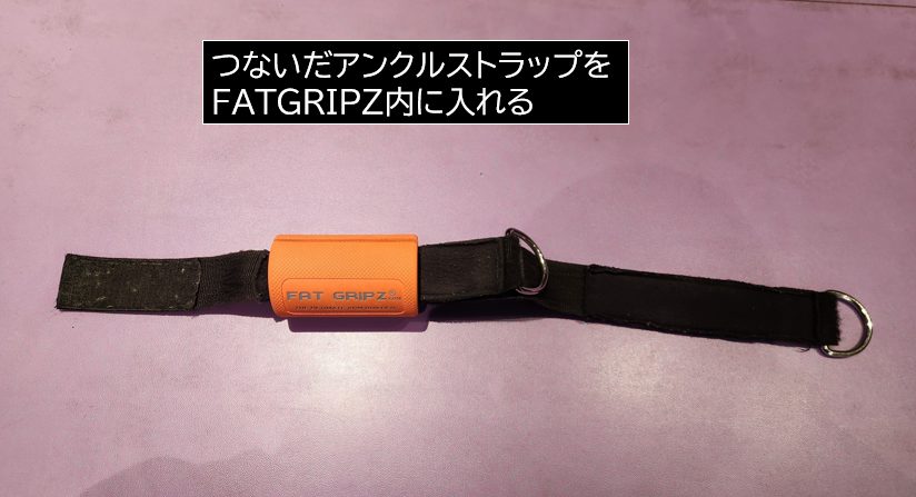 連結ツールとしてアンクルストラップを使用することで、長さ調整が可能になります。サイズが違うケトベルでも、最適な位置にFATGRIPZを取り付けることができます。具体的な製品は今思いつきませんが、長さ調整ができて耐久性があるベルトなら何でも良いです。
