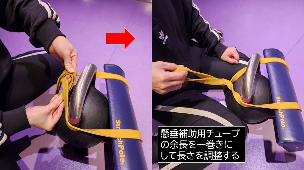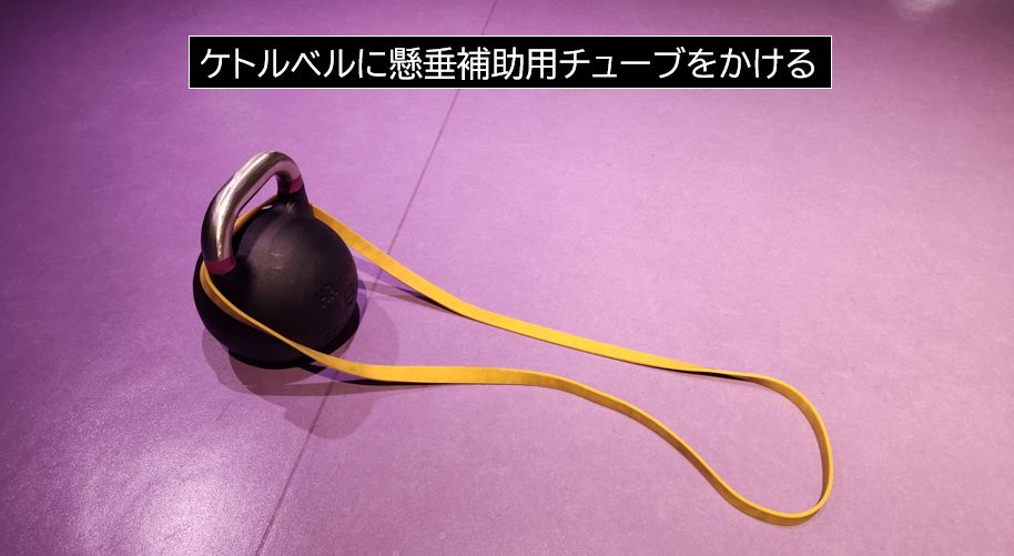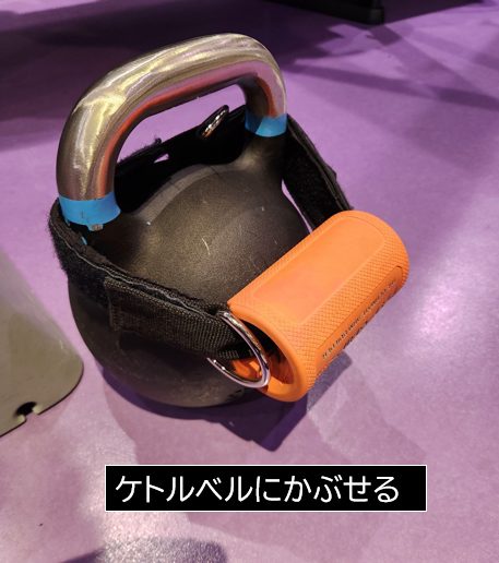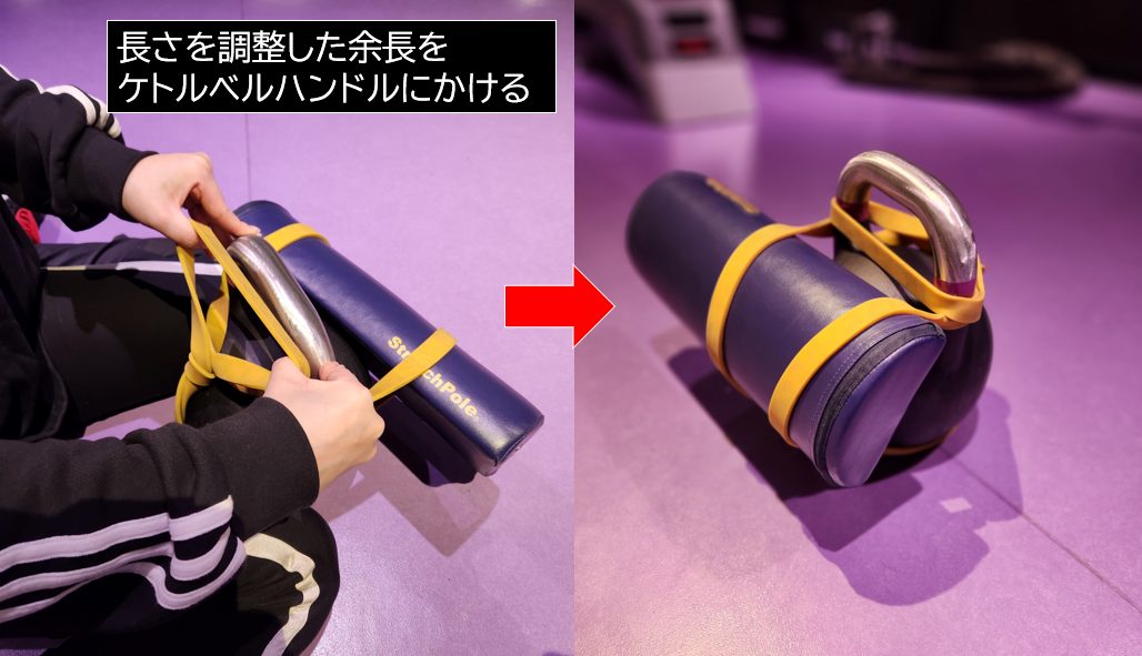 懸垂補助用チューブでストレッチポールhalfカットをケトルベルに取り付けます。