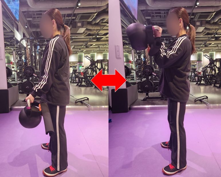 上写真が示す通り、変則的ケトルベルカールはトップ位で負荷が高まる位置にケトルベルがきます。これが特長です。