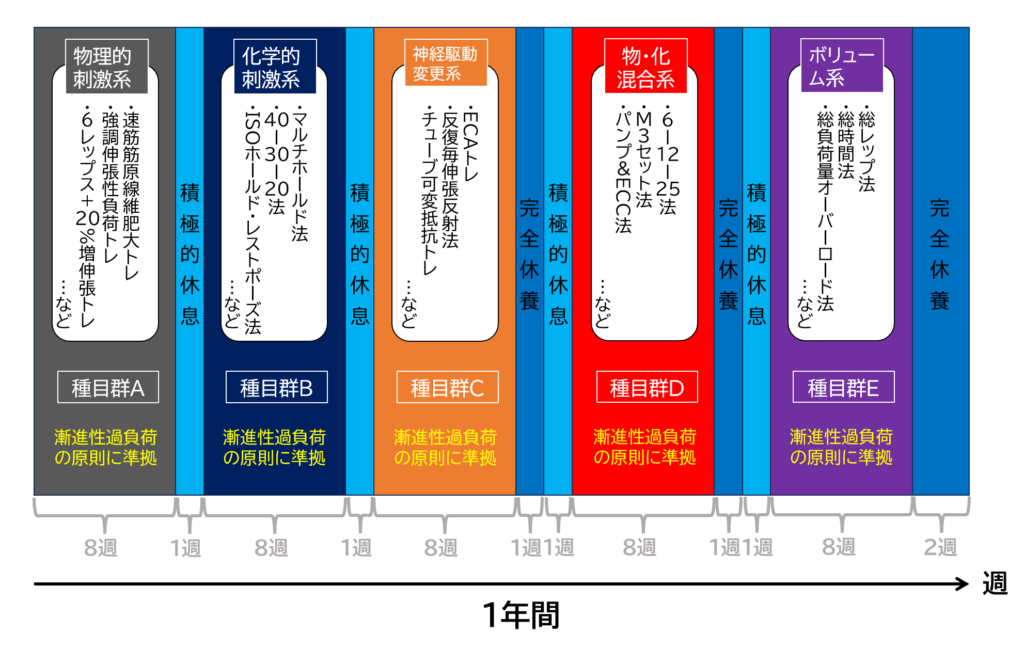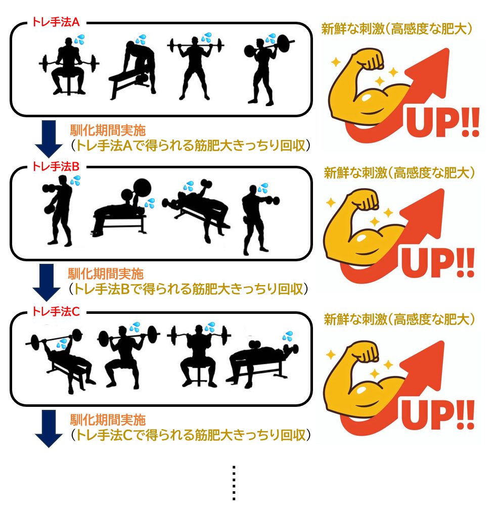 敢えて馴化させてから次の異なる手法を与えることで、体は" 新鮮さ(脅威) " を感じ、高感度な筋肥大反応が期待できます。また、馴化中は、その期間のトレ手法で得られる筋肥大を取りこぼすこと無く享受できることも期待できます。