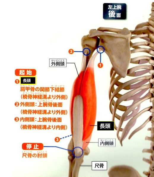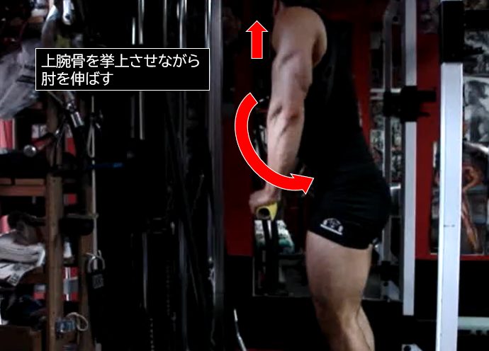 上腕骨を挙上させながら肘を伸ばすと、上腕三頭筋の短縮刺激が高まります。上腕骨を挙上させる筋肉の1つが上腕三頭筋長頭だからです。
