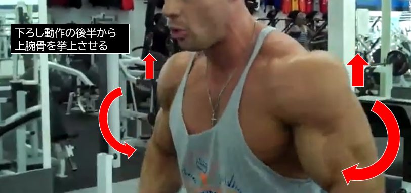 Negative動作(下ろす動作)の後半から上腕骨を挙上させると、三角筋側部の伸張刺激が増します。主な理由としては、筋腹が突き上げられて、三角筋側部のテンションが増すからだと思っています。