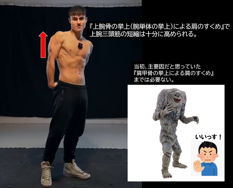 当時の見解では『肩甲骨の挙上によって肩をすくめる』が上腕三頭筋の短縮を高める主要因でしたが、現在では考えが変わり、『上腕骨の挙上によって肩をすくめる』が主な理由だと思っています。確証がないところは当時と変わっていませんが。