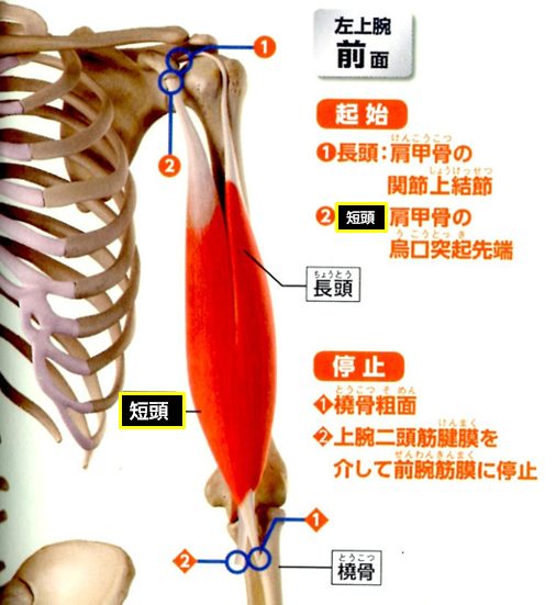 上記の『肩下げ&若干の肩関節屈曲を行ないながらカール』については、加藤昌平選手の動画が参考になります。こうすることで、上腕二頭筋の起始と停止が近づいて短縮刺激を高めることができます。