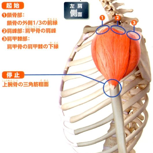 先に説明した通り、上腕骨を挙上させる筋肉には『三角筋』『上腕三頭筋長頭』『上腕二頭筋短頭』『烏口腕筋』があります。これらの内、上腕骨挙上への関与が最も大きい筋肉は『三角筋側部』で、次いで『三角筋後部』になります(Halder氏他5名の研究)。