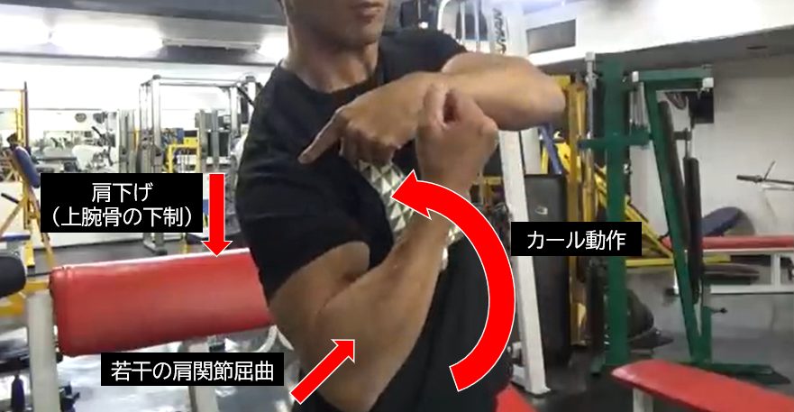 肩下げ&若干の肩関節屈曲を行ないながらカール