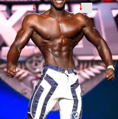 これらポーズにおける肩の張り出しで重要な要素は、当然ですが三角筋のサイズ、肩甲骨の位置(外転及び若干の上方回旋位)になります。これに上腕骨の挙上が加わることで、肩がポコッと突き出て肩の張り出しが強調されます。